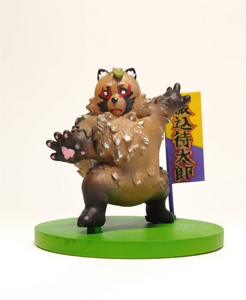 と、歌舞伎の見栄をきるポーズとタヌキをかけあわせて